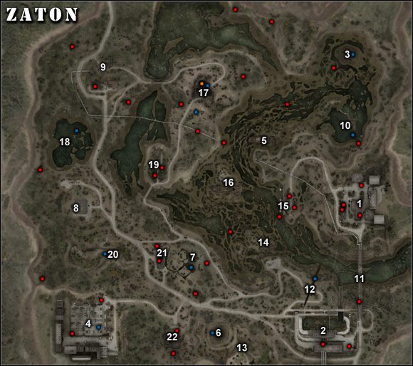 Самые важные места на карте: 1. Forester's Lodge - локация, связанная с квестом 11 (Транзакция). Пикапы на севере - консервы. В одной из машин в большом ангаре - боеприпасы и винтовка. В узком здании на западе, за машиной - аптечки и ячейки Гаусса. На первом этаже (лестничный вход) дробовик и патроны.