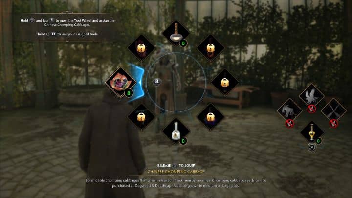 В программу будет включен учебник по использованию вспомогательных средств (Tools). Вы должны удерживать кнопку вызова меню на колесе инструментов (L1/LB на панели). В меню колеса выделите китайскую пекинскую капусту.
