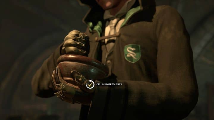 Создание первого зелья требует дополнительных действий - совершайте вращательные движения правой аналоговой ручкой (против часовой стрелки), нажмите кнопку взаимодействия, чтобы добавить больше ингредиентов, и размешайте их в котле вращательными движениями в обратном направлении (на этот раз по часовой стрелке). Вы создадите зелье Вигген (целебный отвар).